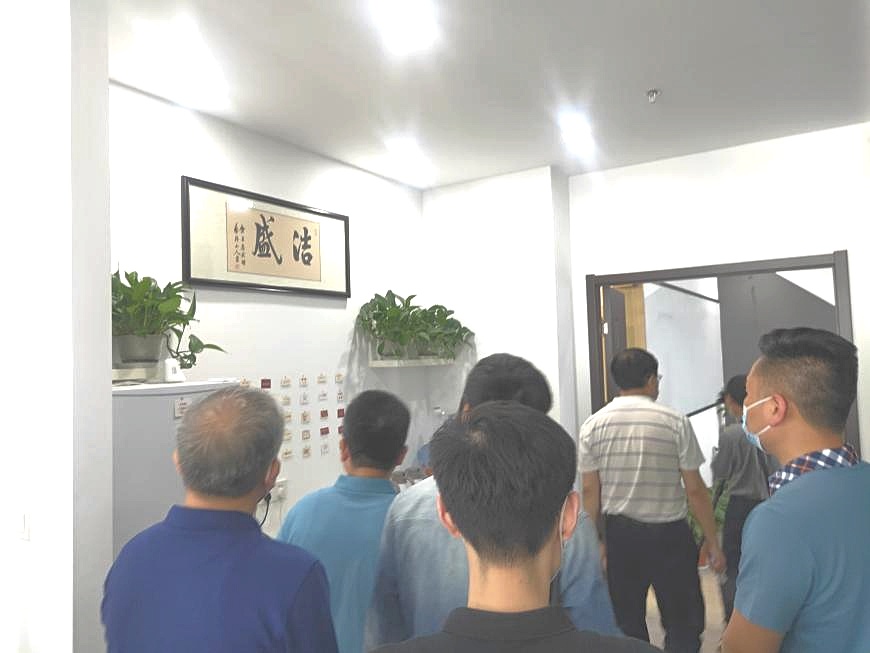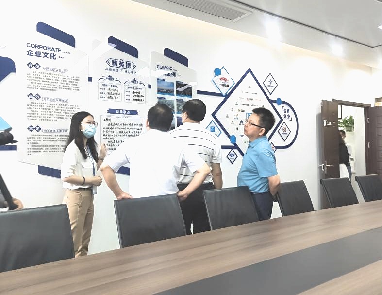 驻足会议室一侧,视察组一行领导结合企业文化墙与现场讲解,初步了解公司整体运营、市场布局、战略客户与工程案例。
