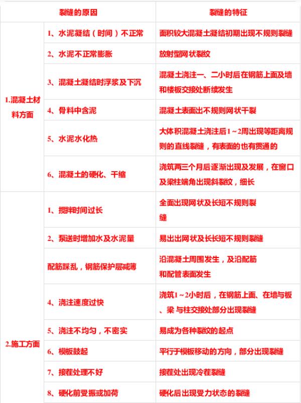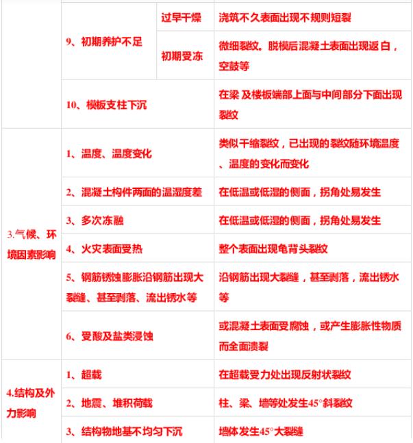 混凝土裂缝产生的原因多种多样,有原材料方面的,也有施工方面的,气候、环境及外力方面的。详见表1